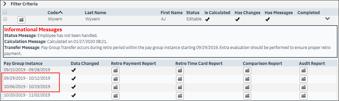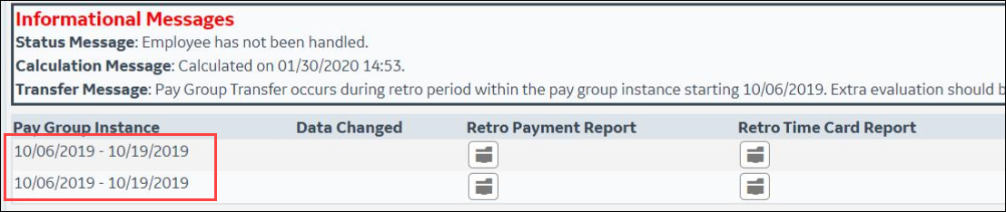 If an employee transferred pay groups during a pay period in the Retro Calculator job, the message states, "Pay Group Transfer occurs during retro period within the pay group instance starting [date]. Extra evaluation should be performed to ensure proper retro payment."