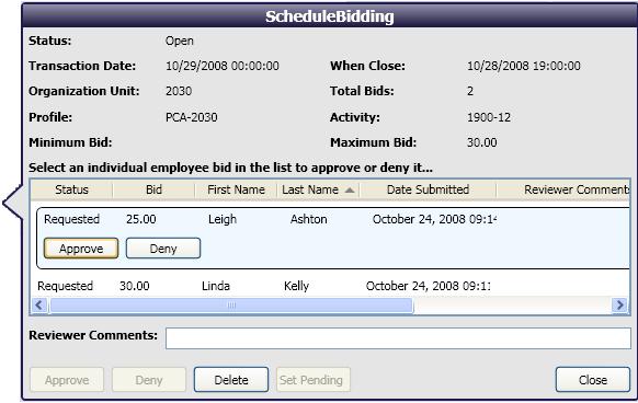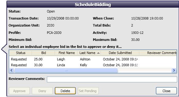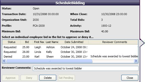 . For more information, seeAuthorized users can view the details of the Schedule Incentive requests, including the employees who have submitted bids and the amounts of the bids. The can also handle requests from this screen, approving or denying bids.