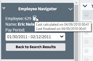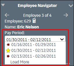 The Employee Navigator is used to change the pay period view of the current record, to search for the record of another employee when an employee record is already open, or to scroll between records of employees when multiple records were selected during an employee search.