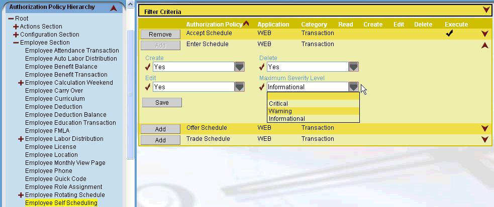 The screen below shows the location for setting the employee access to the self scheduling features, and also sets the level that employees are allowed to override any validation exception messages when submitting or editing schedules.